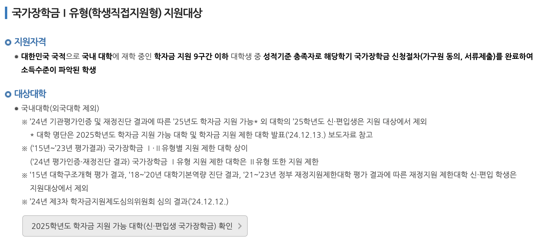 <2025학년도 국가장학금 지원 가능대학 및 학자금대출 제한 대학 안내>