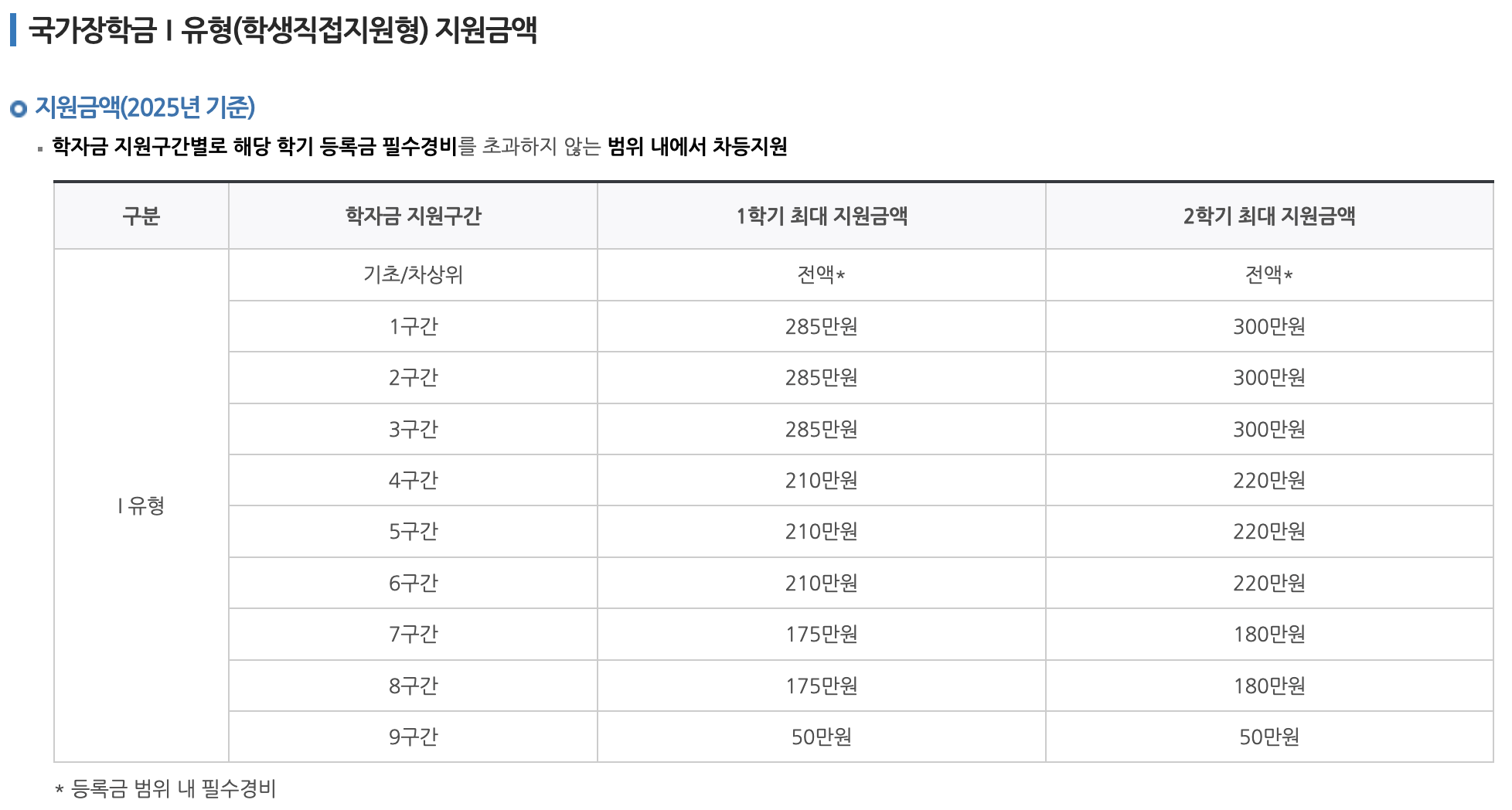 2. 2025 국가장학금 소득분위별 지급금액 (Ⅰ유형 기준)