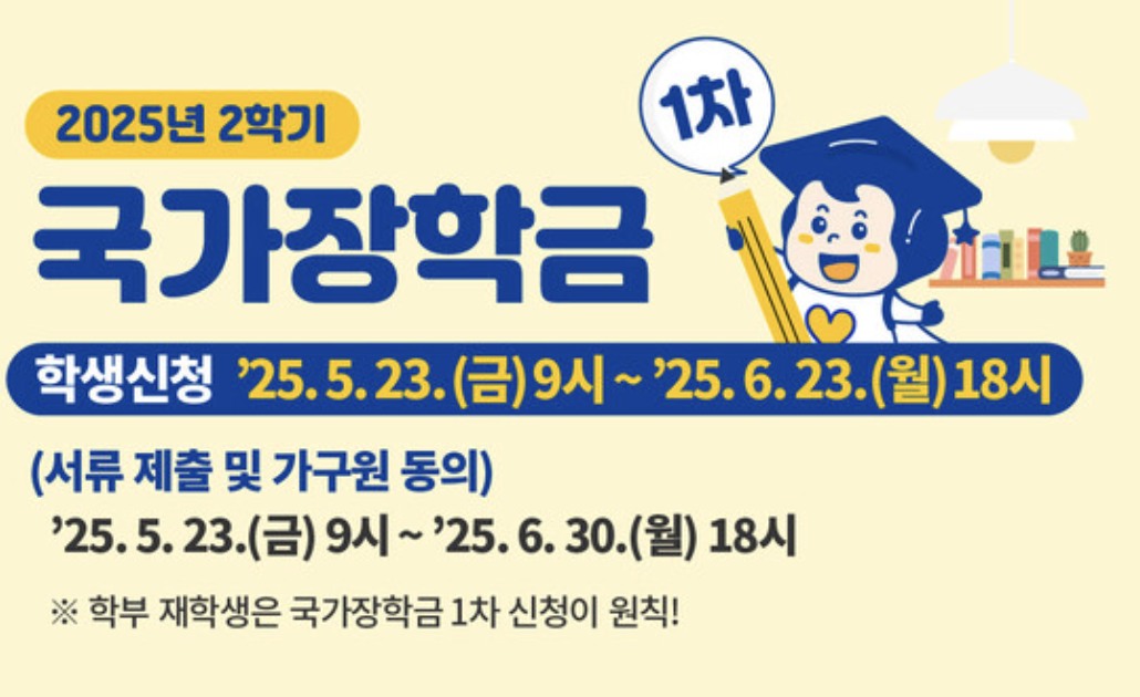 교육부와 한국장학재단은 2025학년도 2학기 국가장학금 1차 신청을 2024년 5월 21일(화)부터 6월 23일(일) 오후 6시까지 진행한다고 밝혔습니다.