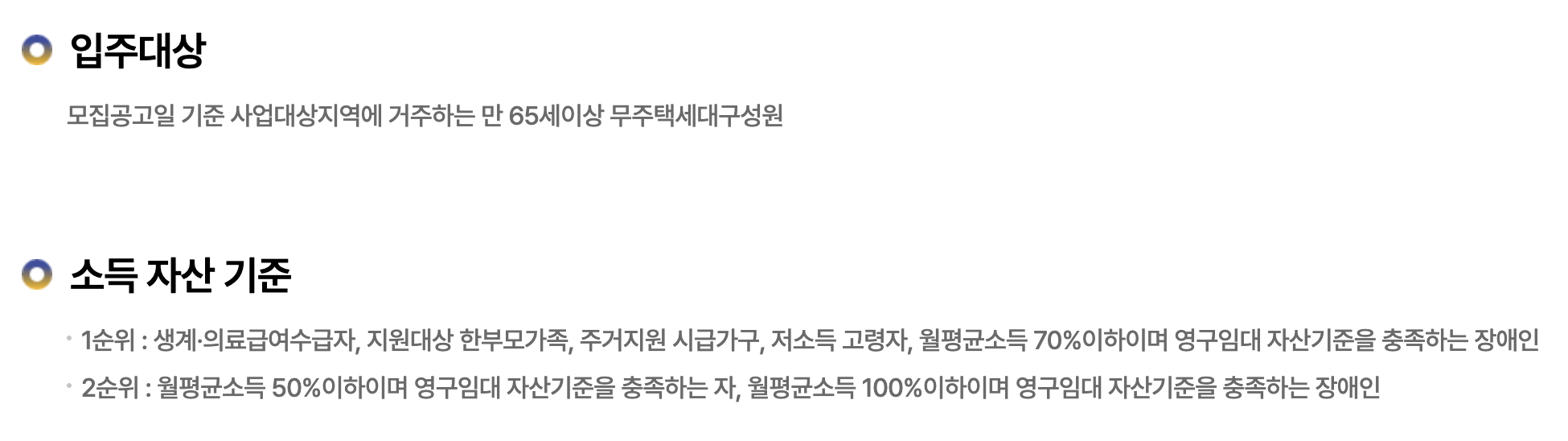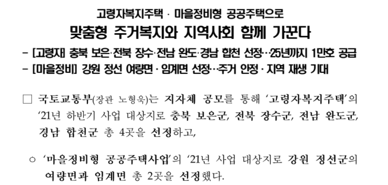 | 우선공급 대상 | - 기초생활수급자 - 차상위계층 - 독거노인 - 노인 부부세대 - 장애·장기요양 대상자 등 |