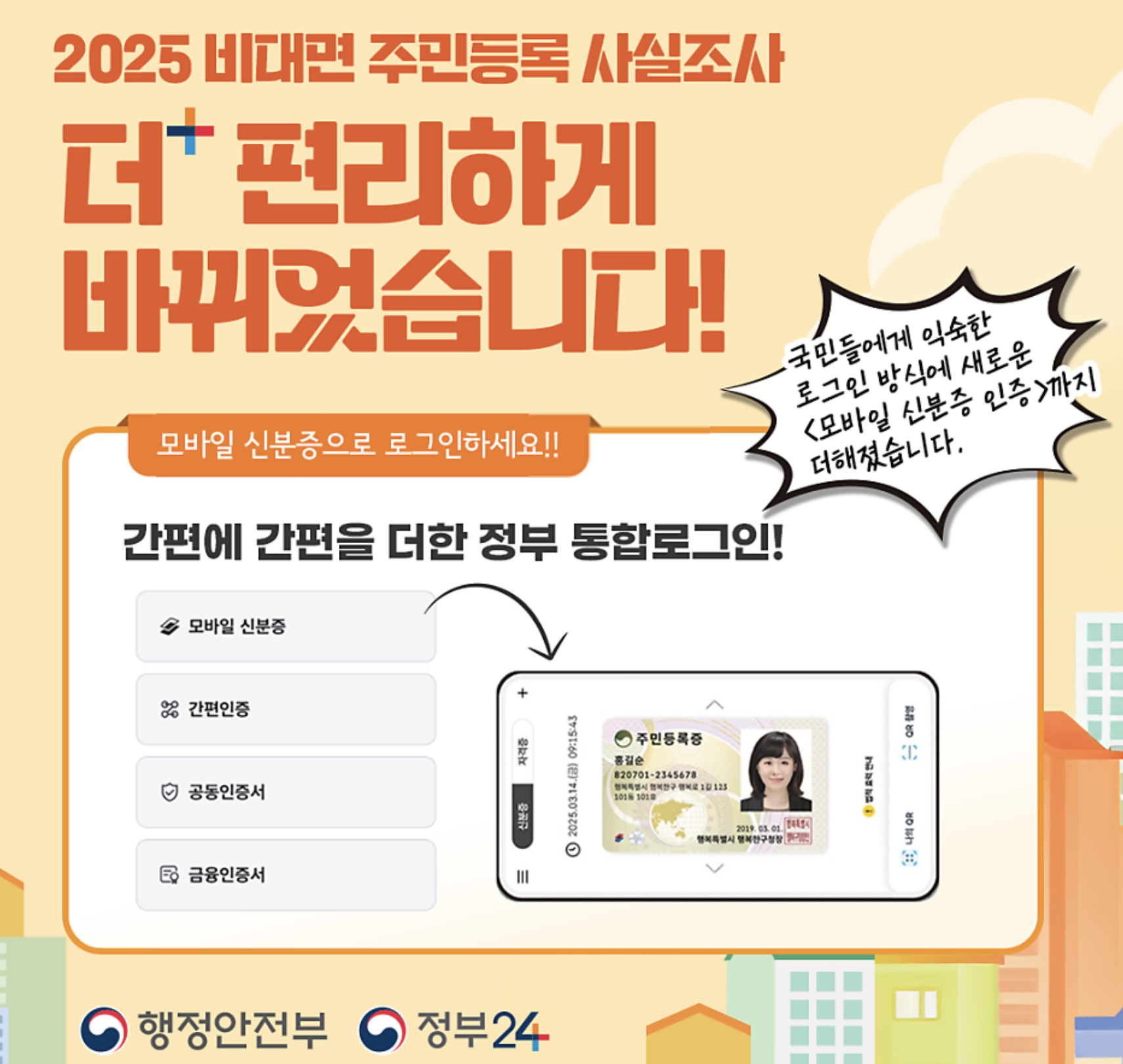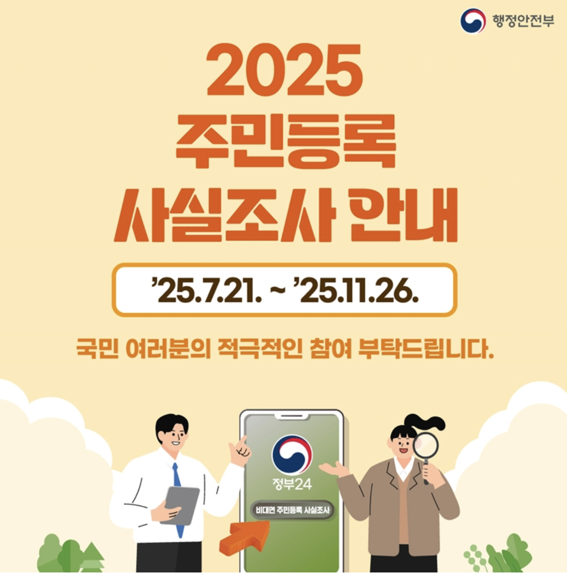 결국 주민등록 사실조사는 국가가 국민에게 요구하는 의무이자, 국민이 국가로부터 더 나은 서비스를 제공받기 위한 최소한의 협력이라고 할 수 있습니다. 이번 비대면 조사를 통해 개인의 정보가 정확히 관리될 때, 우리의 복지·선거·안전·행정 서비스는 더욱 투명하고 공정해질 것입니다.