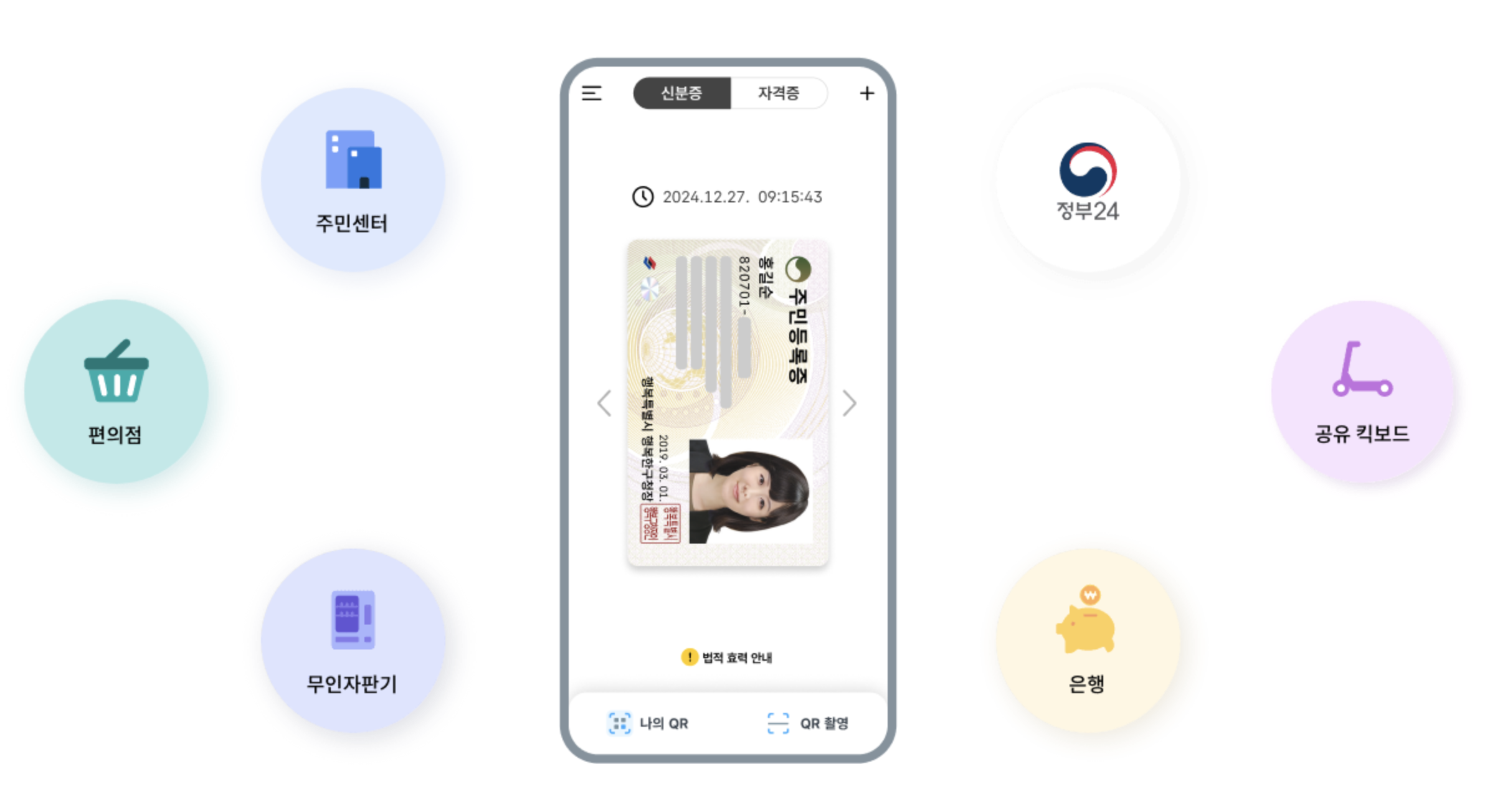 모든 인증이 완료되면 모바일 주민등록증이 발급됩니다. 이후 앱에서 QR코드, 바코드 형태로 언제든지 제시할 수 있으며, 오프라인 기관이나 은행 창구에서도 공식적으로 인정됩니다.