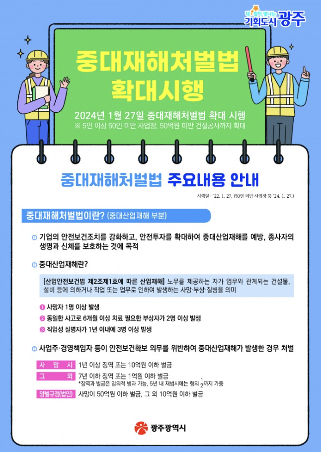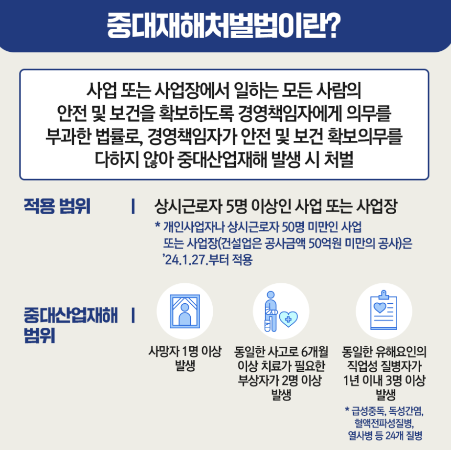 사업장 안전의 ‘마지노선’을 제시하는 중대재해 처벌 등에 관한 법률(이하 중대재해처벌법)은 2022년 제정 이후, 2024년 1월 27일을 기점으로 적용 대상이 대폭 확대되었습니다. 본 글에서는 적용대상, 경영책임자 의무, 처벌 규정, 그리고 실무적 대응 전략까지 한눈에 정리합니다.