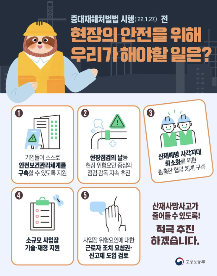 가장 중요한 변화는 상시근로자 5인 이상 사업장이라면 업종을 불문하고 모두 법 적용 대상이 된다는 점입니다. 즉, 과거에는 대기업이나 대규모 건설현장에만 국한되었던 법이 이제는 중소기업, 영세한 제조업체, 서비스업 사업장, 심지어는 개인사업자까지 포함하게 된 것입니다. 다만, 여전히 상시근로자 5인 미만 사업장은 적용 대상에서 제외되며, 이는 소규모 영세 사업장의 현실적 여건을 고려한 조치라고 볼 수 있습니다.