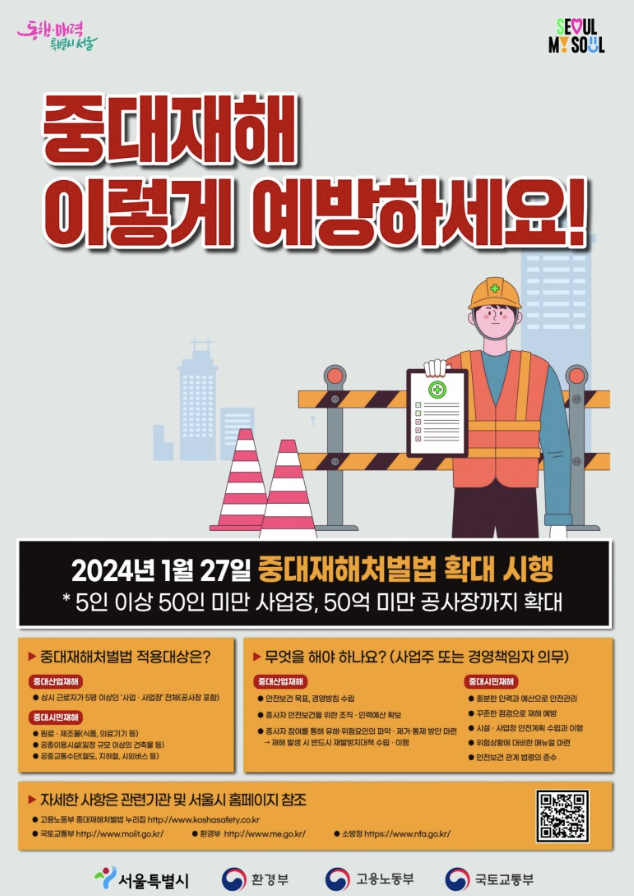 이처럼 2024년 개정으로 인해 중대재해처벌법 적용대상은 ‘대기업 중심 → 모든 업종·중소규모 사업장 포함’으로 확대되었고, 그만큼 더 많은 경영자와 사업주가 법적 책임을 인식하고 안전보건 관리체계를 강화해야 하는 상황에 놓였습니다.
