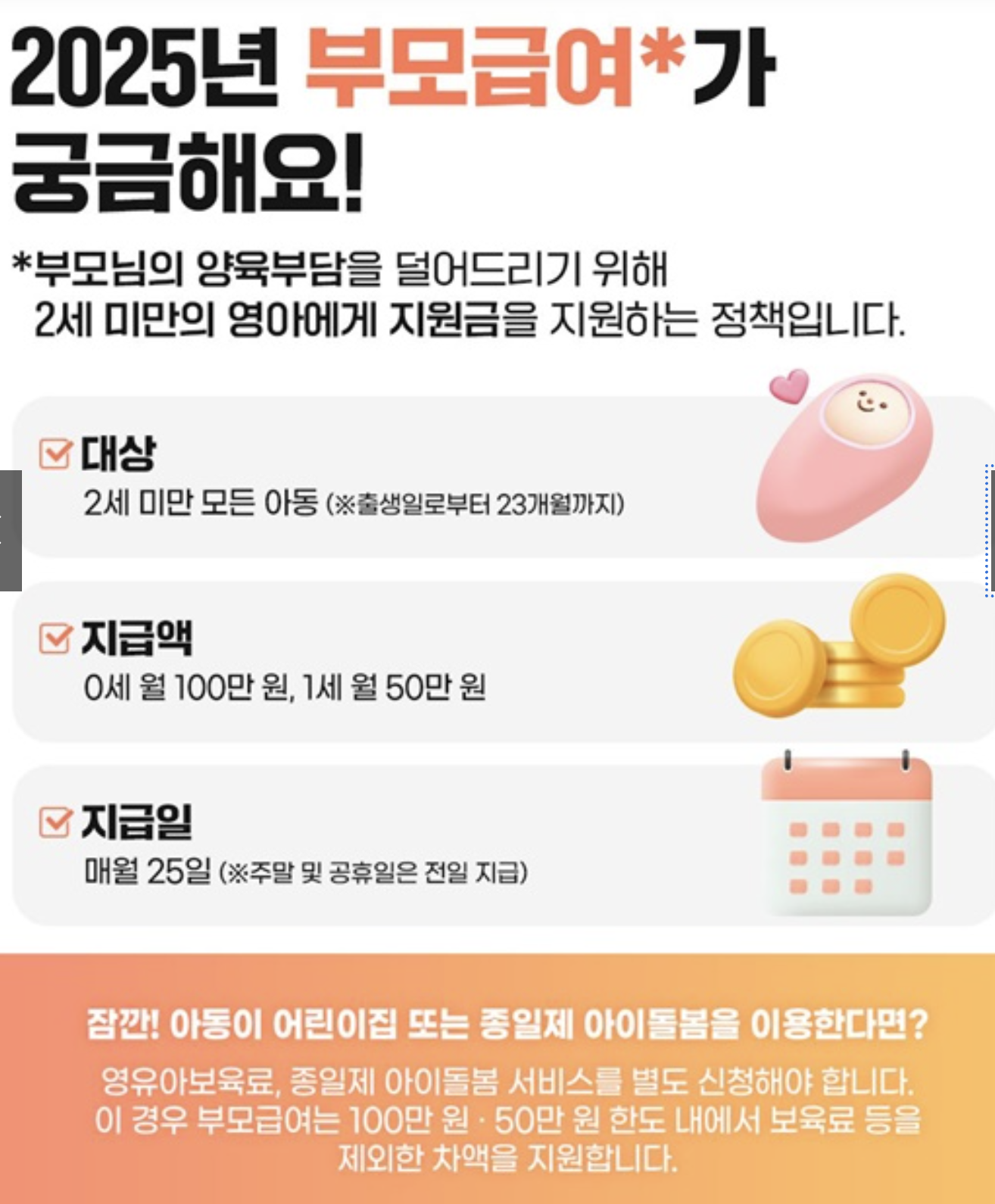 단, 전액 현금으로 지급되는 것은 아니며, 양육 형태(가정 양육 vs 어린이집 이용)에 따라 현금 수령액이 달라집니다. 바로 이 부분이 2025년 하반기 변동에서 가장 중요한 지점입니다.